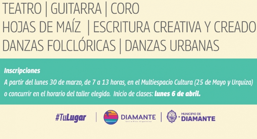 La Municipalidad de Diamante invita a participar de los distintos talleres gratuitos, impulsados desde la Dirección de Cultura.